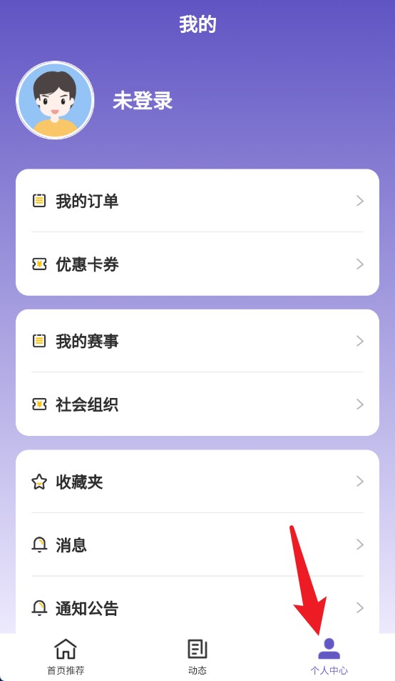 4、点击进入“个人中心”,在这里你能够查看订单详情、卡券情况、参赛信息以及系统通知,同时还可以对个人健身账户进行管理。