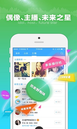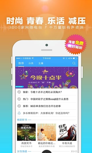 3. 数千家网络有声自媒体、互动电台以及知名声优已签约入驻,节目24小时持续更新,内容丰富多彩。