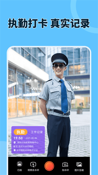 5、能够对各类工作的执勤打卡进行真实记录,并拍摄内容良好的水印相片。
