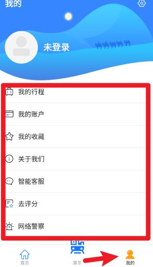 3、轻点“我的”页面,即可进入个人中心,在此能够对行程、账户、收藏等内容进行管理,同时还提供智能客服与网络举报服务。