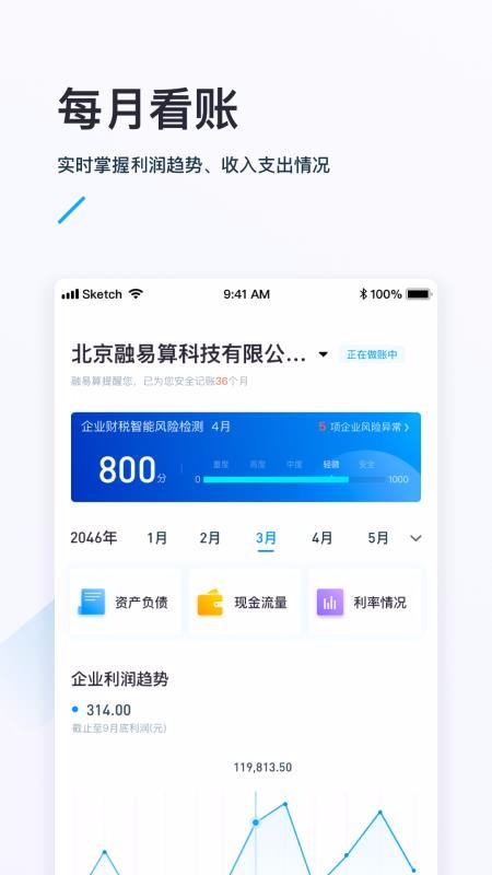 回顾历史财税,在可随时查看财务报表的情况下,能够对今年任意一个月的财务数据展开回顾。