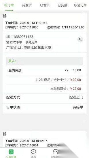 3、具备在线即时接单功能,商家端可实时同步用户端下达的买菜订单。