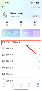 1、打开软件后,点击“我的”界面,找到车联网卡实名认证选项。