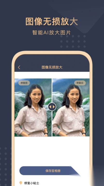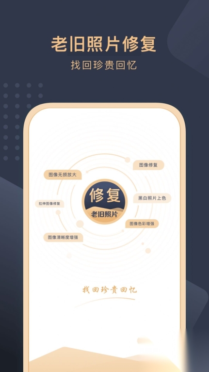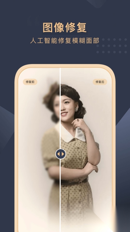 2、这是一款专门针对老旧照片修复的APP,为50后、60后、70后、80后提供照片修复、黑白上色等智能AI服务。