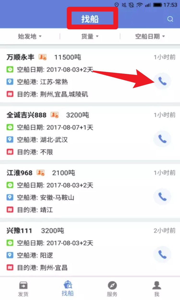 3. 成功登录后,点击下方的「找船」功能,系统将展示来自全国各地的船东资源,你能够直接拨号联系,迅速对接空船信息。