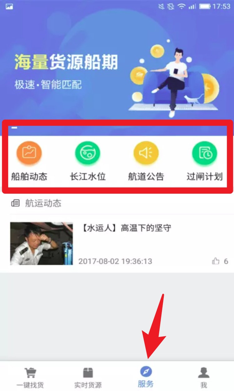 4. 轻点底部菜单中的「服务」栏目,就能浏览船舶动态、水位公告、航道计划等各类资讯,精准掌握实时水运动态,为调度安排提供有力辅助。