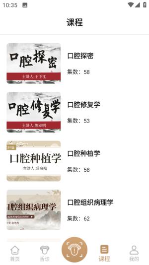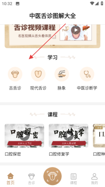 1、在这个主页上,将四大学习模块设计成圆形图标,放置在页面中间位置。点击“古舌诊”,可直接进入相应内容。下方的课程展示栏会滚动呈现热门课程,用户想要学习的内容一目了然,一眼就能找到。
