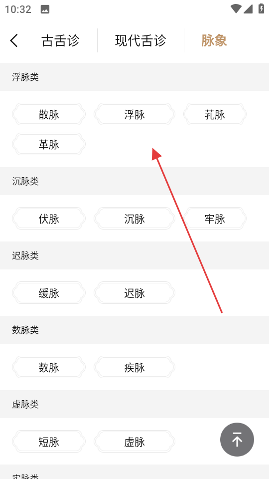 3、切换至脉象标签,即可查看各类脉象分类。浮脉类、沉脉类等排列得井然有序,点击每个脉象按钮,都会出现详细说明,新手也能迅速找到相应的诊断方法。