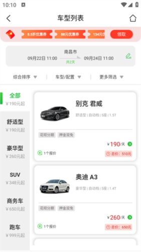 4、完成选择后,点击“选车车”,进入选车页面,挑选自己想要租赁的车辆。