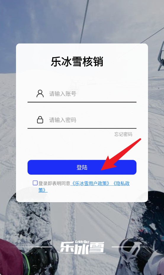 1. 在登录页面输入账号和密码,勾选协议后,点击“登陆”,就能进入乐冰雪核销系统的主页。