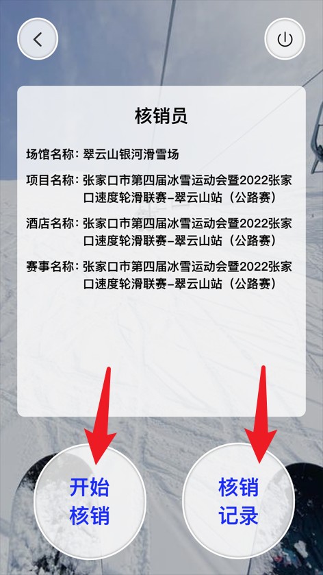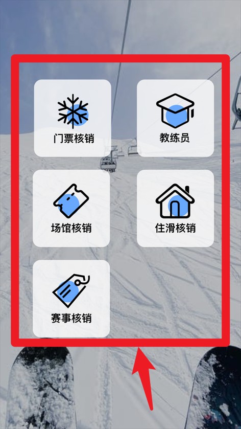 2、进入主界面后,有门票、教练员、场馆、住滑、赛事等多种核销功能入口可供选择。