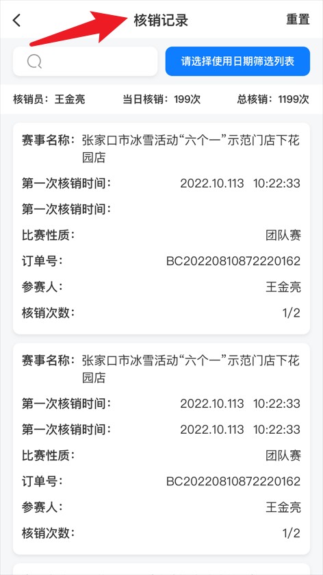 4、在核销记录里,能够依据日期进行筛选,进而查看每位核销员的核销次数以及相关参赛信息的具体明细。
