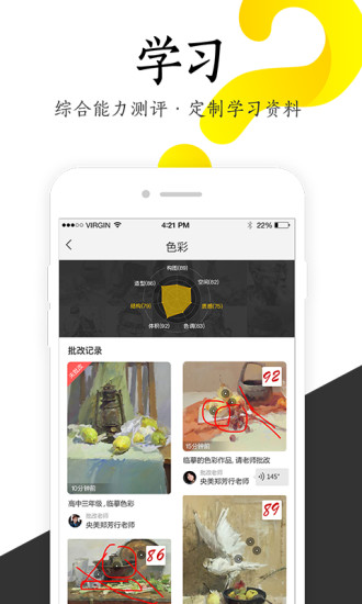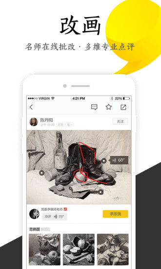 创新性推出“语音打点 + 红笔批改”的评画功能,从多个维度对上传作品进行点评,同时支持实时在线交流,帮助解决绘画过程中出现的各类问题。