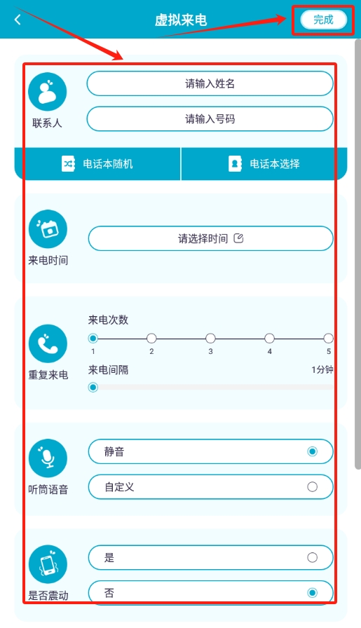 2、打开软件,进入主界面,找到 “虚拟电话” 功能入口并点击进入,在相应位置输入来电相关信息,输入完毕后,点击右上角的 “完成” 按钮。