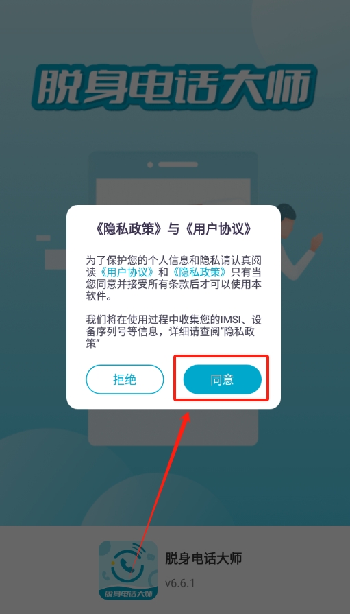 1. 初次打开脱身电话大师软件时,页面会弹出软件协议,认真阅读完毕后,果断点击同意选项。