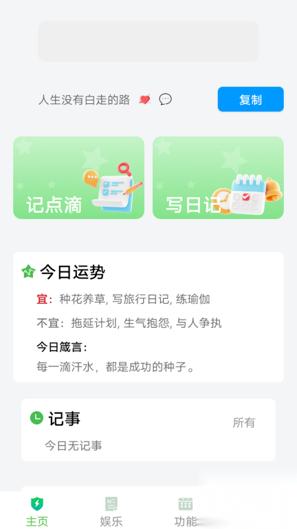1. 在主页面,你能够记录点滴、撰写日记,还能知晓今日运势、进行记事等操作。