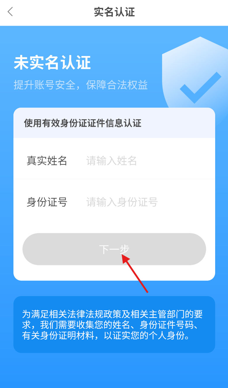 3、于认证页面,如实准确填写个人身份证号、姓名等相关信息,认真仔细核对确保无误后,点击“下一步”以完成认证。