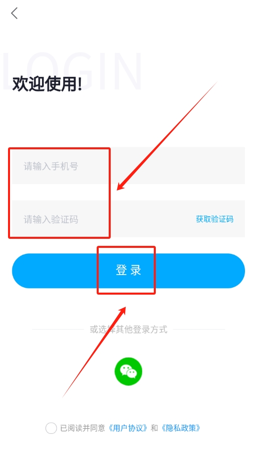 2、同意协议之后,会进入登录页面。在此页面的相应位置输入个人手机号,获取验证码并填写进去,即可完成登录。