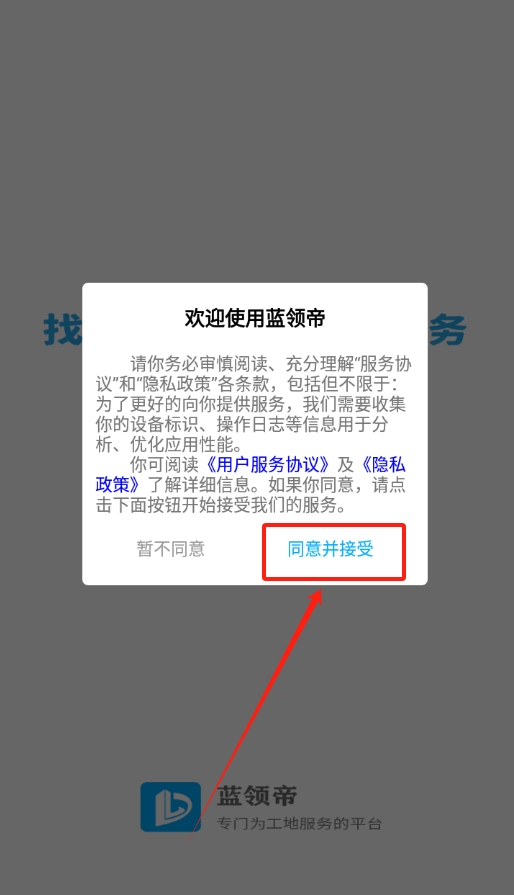 1. 初次打开蓝领帝app时,软件协议会在页面弹出,只有点击“同意”,方可继续使用该软件。