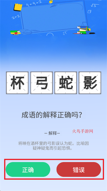 2. 遇到成语解释类题目时,根据所给释义点击【正确】或【错误】按钮来完成作答。