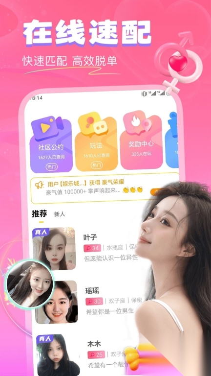1. 在线速配功能,实现快速匹配,助力你高效脱单。交友脱单进程清晰可见,速度超给力。