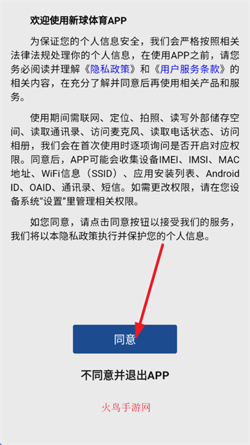 1、第一步,打开新球体育app,仔细阅读《隐私政策》与《用户服务条款》后点击同意。