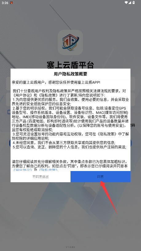1首次使用时,需阅读平台的服务条款及隐私政策,确认无误后,点击“同意”按钮方可进入应用。