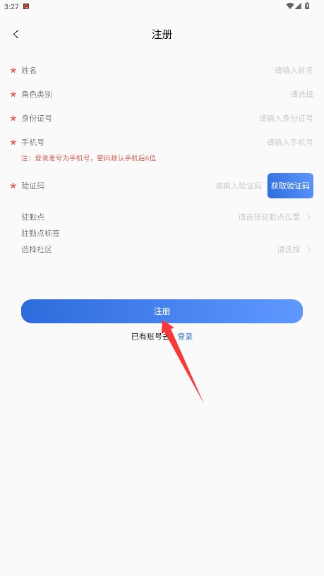 3、依次输入姓名、角色类别、身份证号等信息,接着输入手机号与验证码,点击“注册”按钮即可完成注册。