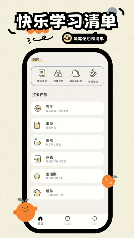 1. 在首页,你不仅能够查看学习清单、思维导图、语音记录等信息,还可以完成诸如喝水等多项打卡任务。