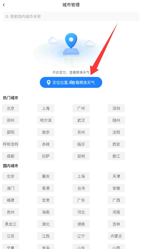 2. 进入天气页面,点击左上角的城市管理功能,通过手动添加或搜索的方式,输入需要关注的城市名称。