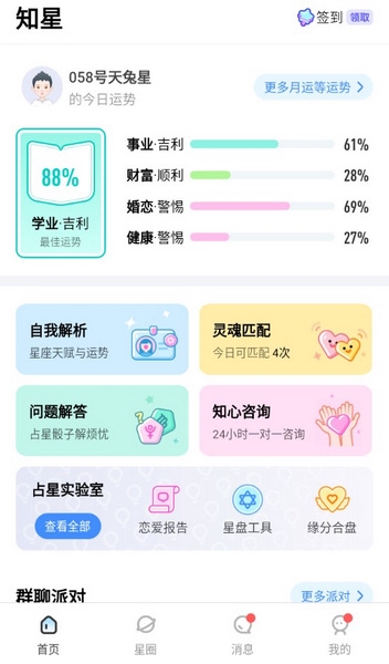 知星专业星盘,助你洞悉每日运势。于知星APP内,小伙伴们借助星盘展示,深入了解自身性格优势、潜力天赋,还有运势分析等内容。快来下载体验吧!
