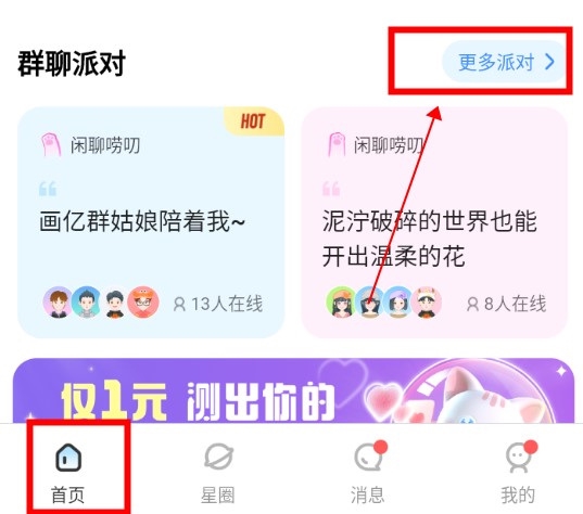 1. 当你安装并打开知星app后,在首页向下滑动,就能找到【群聊派对】板块,接着点击该板块右侧的【更多派对>】,即可进入相应页面。