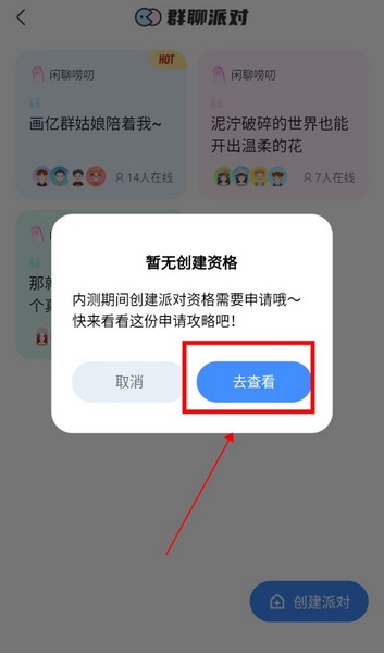 3. 需留意,群聊派对的创建需进行申请,尚无创建资格的用户,可点击【去查看】按钮以详细知悉相关情况。