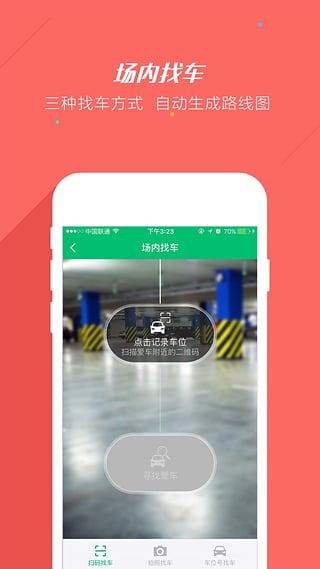 4、场内找车功能:下车后,通过扫描二维码或者输入车位号,即可记住爱车位。
