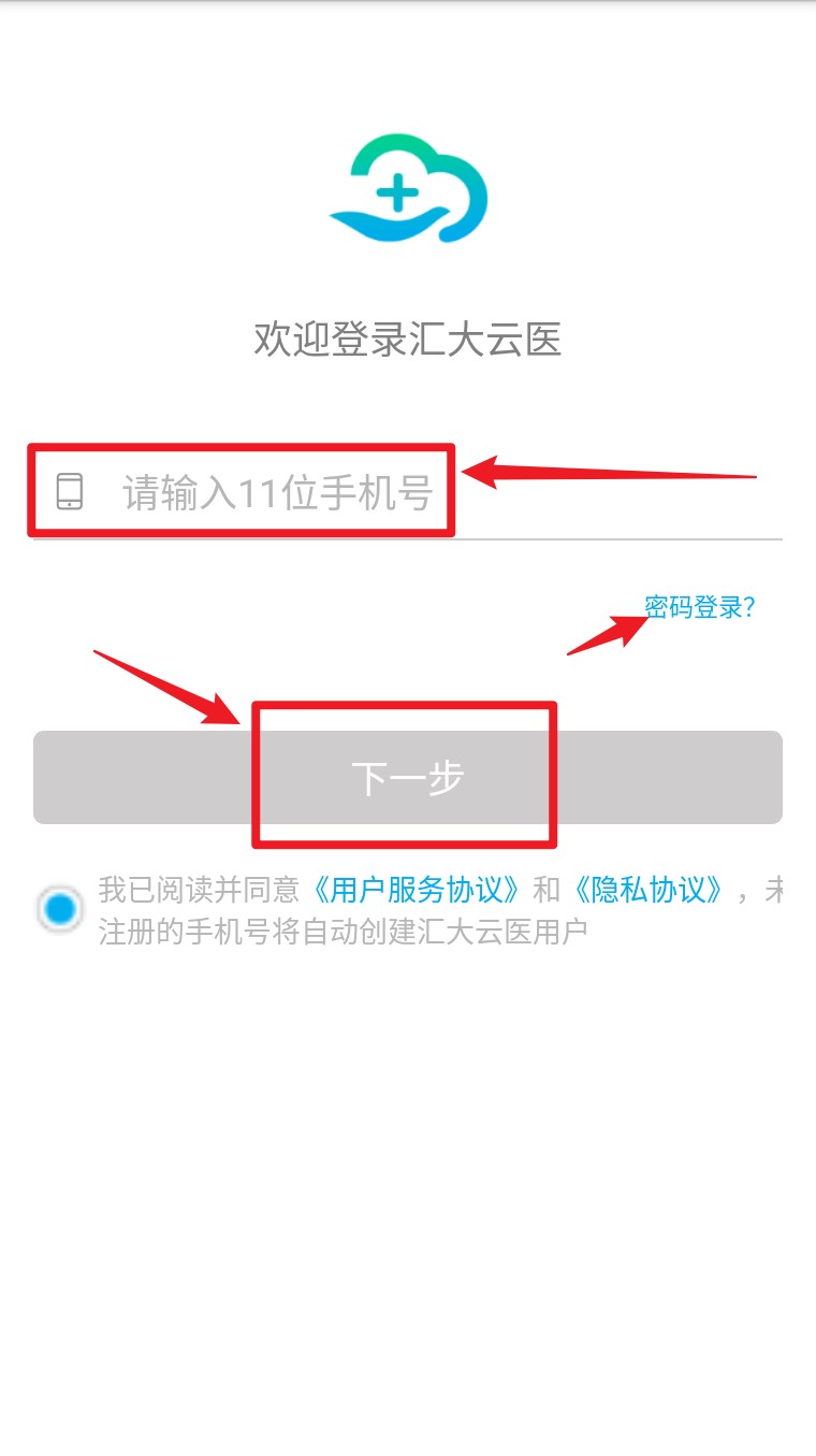 1. 开启汇大云医App,在相应位置输入11位手机号,接着点击“下一步”,跳转至验证码页面,从而完成登录步骤。