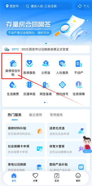 1、第一步,下载并打开i西安app,点击【装修综合补贴】选项进入。
