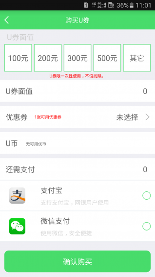 2、<快捷支付>无需下车,直接输入支付金额,支持使用U币、微信或支付宝进行付款,从此无需使用现金。