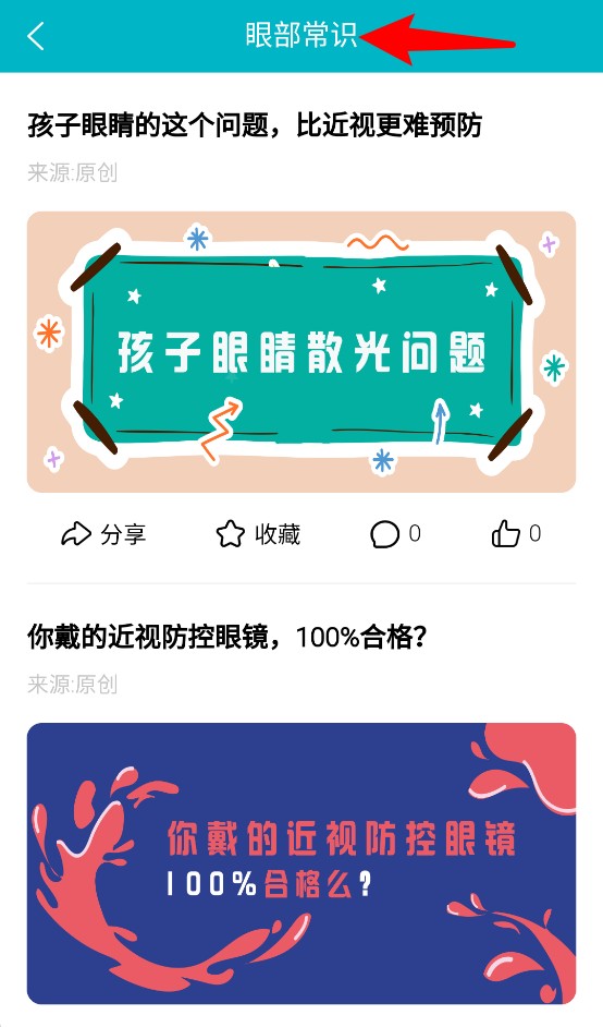 2、轻点“眼部常识”,就能阅读各类护眼科普文章,知悉散光、近视等常见问题的防控知识。