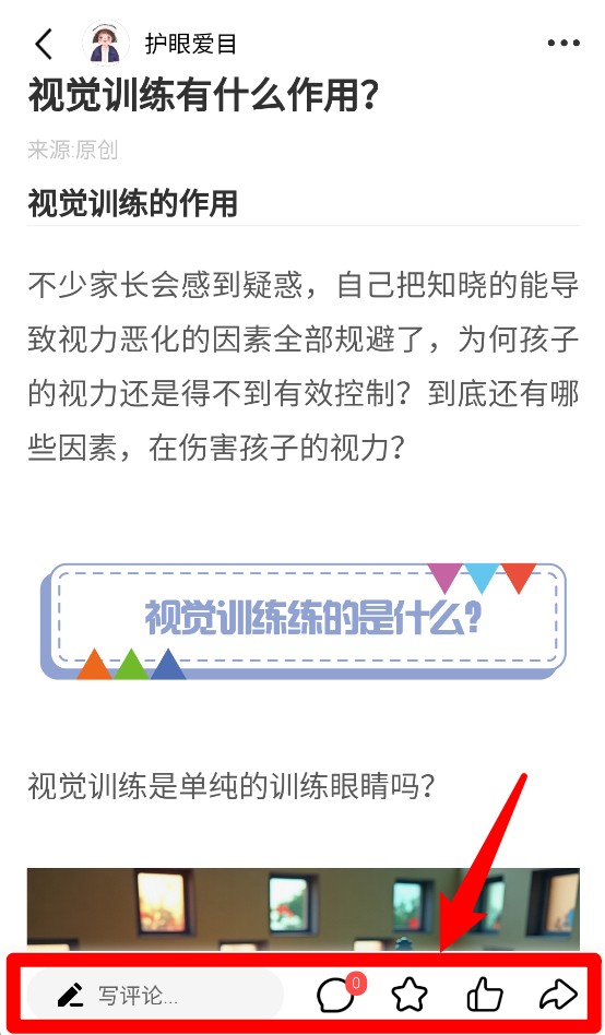 3、当您进入视觉训练内容页面后,能够对文章进行点赞、收藏或者评论操作。这些互动行为不仅可以增强您与内容之间的互动性,还方便您日后进行复习。