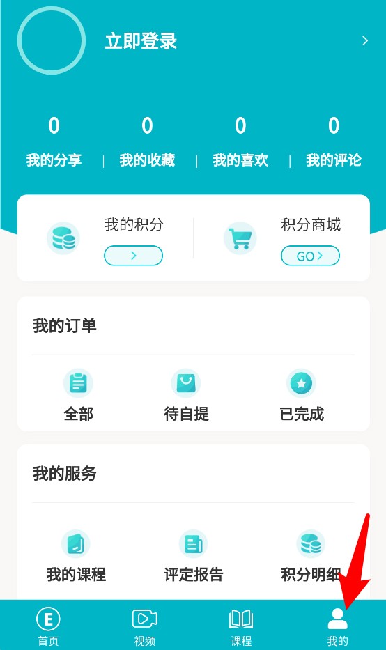 5、您可进入“我的”页面,在此登录账号,并查看订单、积分、课程以及评定报告等个人学习资料。