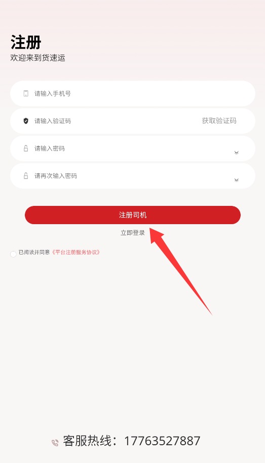 2、于注册页面填入有效手机号,获取验证码,设置满足要求的登录密码,随后点击提交,完成司机账号注册。