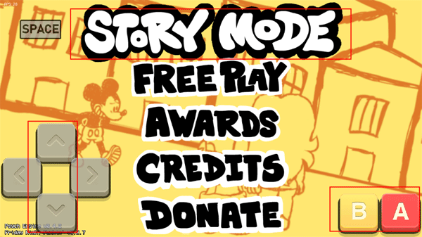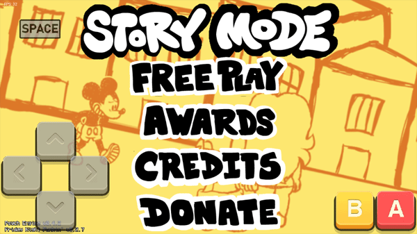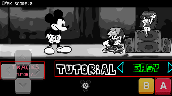 1、启动《Sunday Night Suicide》游戏后,映入眼帘的是一只灰色的米老鼠形象。点击屏幕,即可进入主界面。主界面中,左侧设置有上下左右方向键,右侧则是返回键与确认键。玩家可通过点击上下键,来挑选中间显示的功能选项。