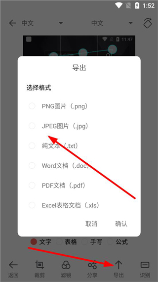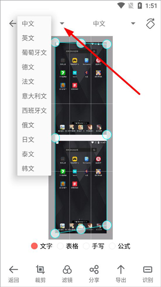 3、在页面左上角识别可切换的识别语言,点击识别图片中的文字,并导出所需格式后即可保存。