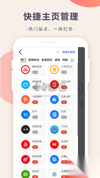 3、快捷主页管理:一方面,能够从我们的热门站点列表中,迅速把图标添加至浏览器主页;另一方面,还支持自定义将喜爱的网页添加到主页。