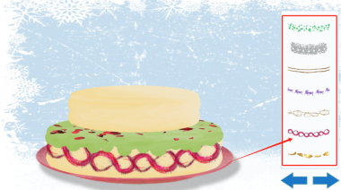 2. 点击红框内的粉色螺旋状装饰,依照箭头指示为蛋糕添加上精美的花边。