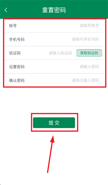 当您进入重置密码页面,依次填入账号、手机号码、验证码以及密码,最后点击提交按钮就可以完成操作。