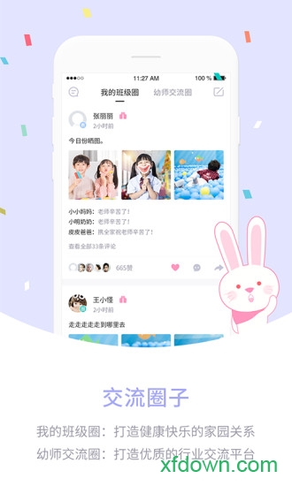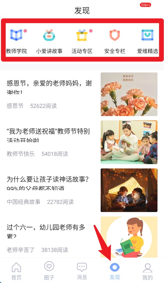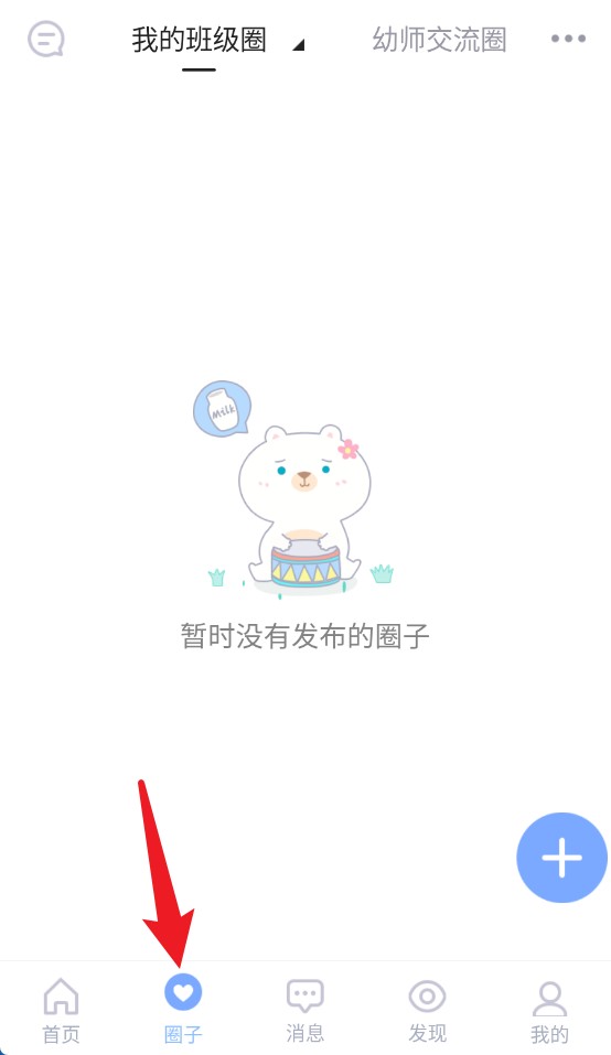 2、轻点“圈子”,即可进入班级圈与老师展开互动,也能查看幼师交流圈内分享的育儿经验。
