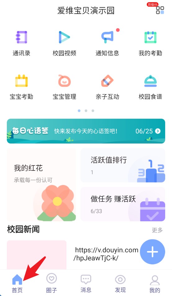 1. 在首页,你能够看到考勤、视频、通知、互动等功能模块,借此了解宝宝在校园里的生活动态。