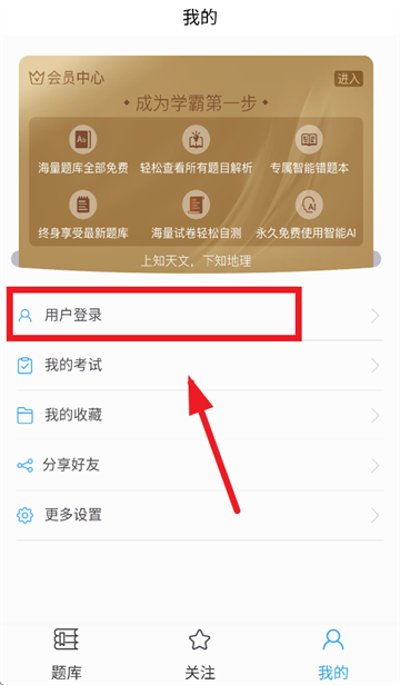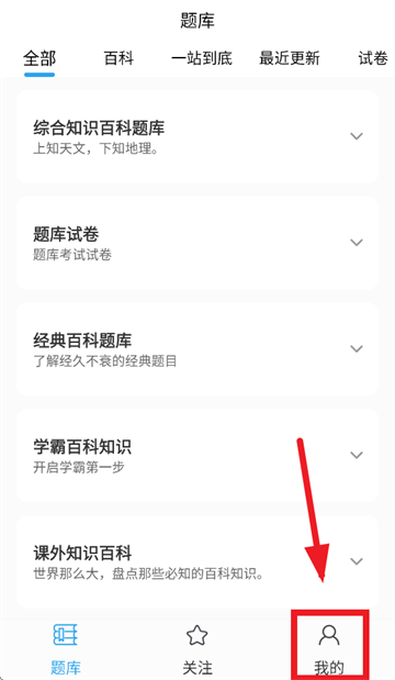 先下载并安装疯狂百科问答app,安装完成后打开该应用。进入到题库首页界面,在此界面中点击“我的”选项。