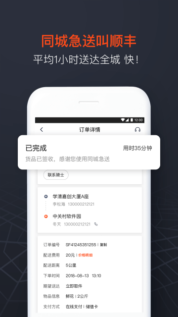 4、依托顺丰在快递行业长年累月沉淀的经验,搭配高效的同城配送智能调度系统,实现即时响应,确保准时送达。